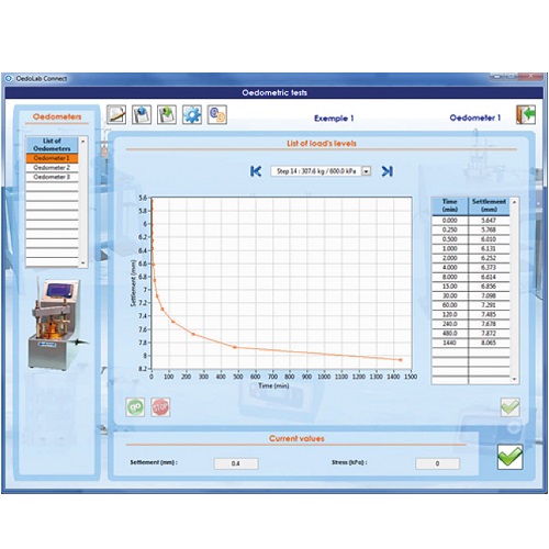 OedoLab bağlantı yazılımı, kullanıcıya basit ve esnek bir grafik arayüz sağlar. Özel bir pencere, kullanıcının çalışmak istediği ödometreyi seçmesine izin verir.