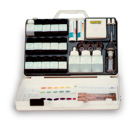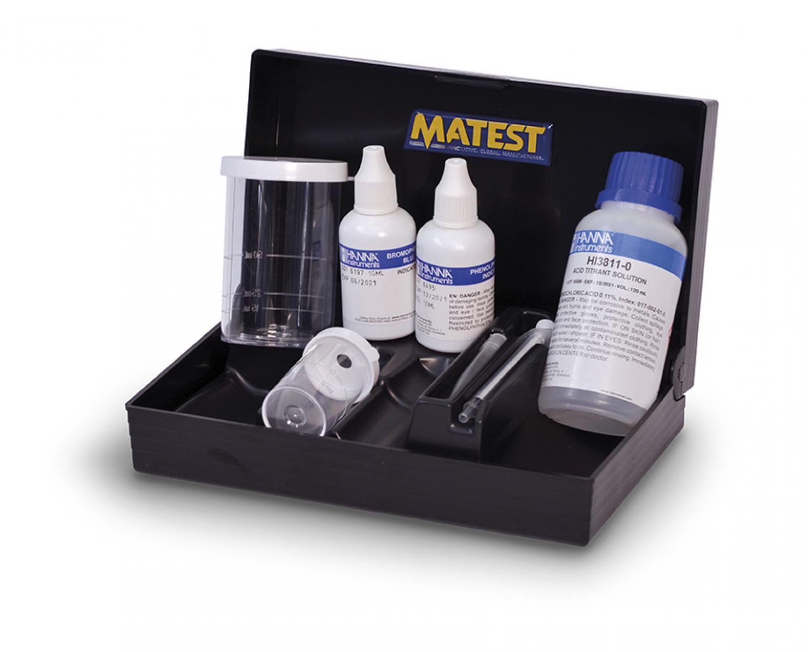 The set comprises different graduated containers, reagents, syringe, pipette, instructions.