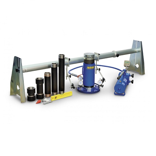 S227-02 Hydraulic jack 500 kN capacity, complete with hand pump, spherical seat, rubber pipe with fast connector, set of extension rods of different lengths, carrying case.