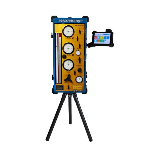 Ручные прессиометры Menard (блок управления) с принадлежностями и, в частности, трубками и 3-элементным зондом для проведения прессиометрических испытаний на месте в почве (испытание грунта статической нагрузкой на месте). Из показаний теста (изменение объема в зависимости от контролируемого давления) можно получить кривую напряжения-деформации в случае плоской деформации, которая дает: